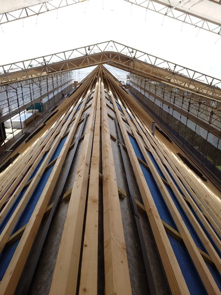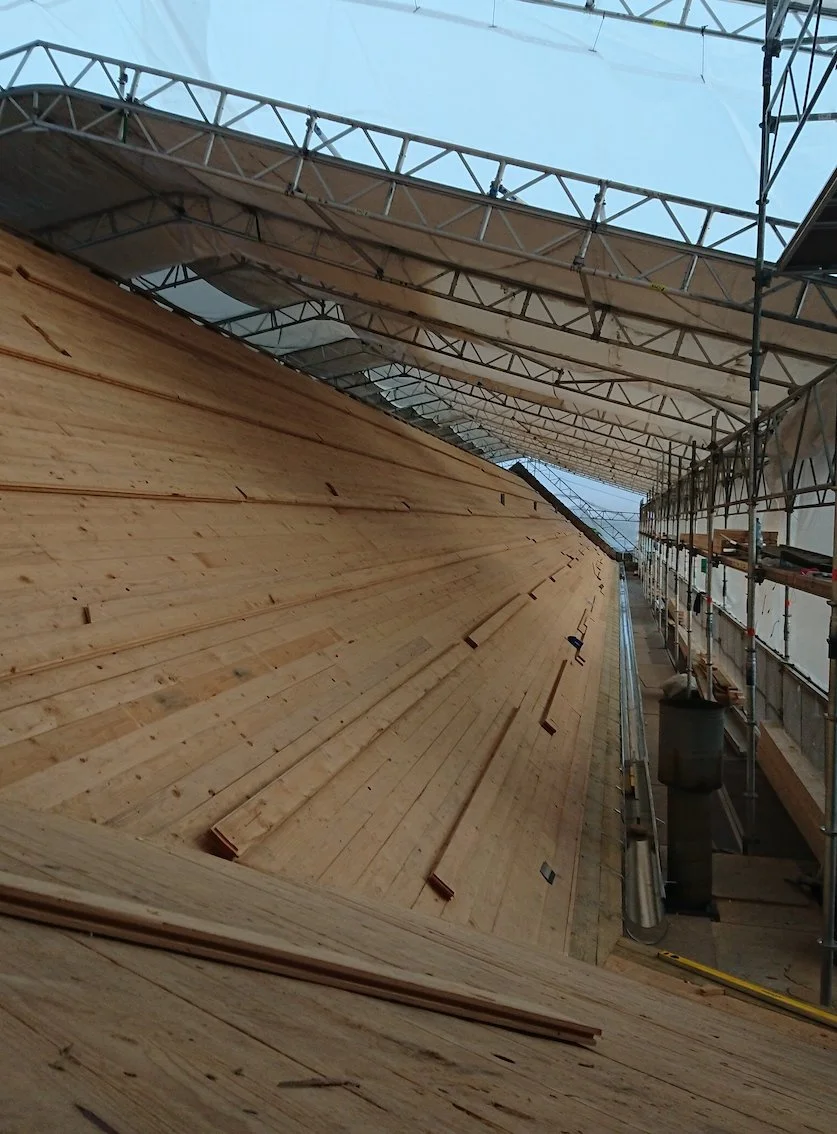 Der er selvfølgelig stadig en masse ubekendte, der kan gøre, at planen justeres, men det er sådan det ser ud lige nu. Billedet viser tagets nye opbygning, lige før det nye undertag af tagpap lægges på.